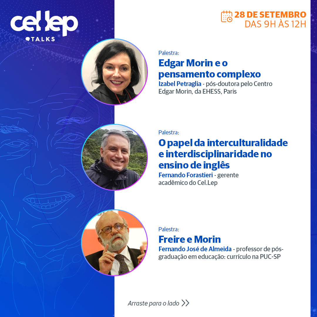 Centenário Freire e Morin: pensamentos convergentes numa relação dialógica com educadores é tema do Cel.Lep Talks, online, gratuito e com certificado. Idealizado pela rede de idiomas que leva o nome do evento e com a curadoria da Educação, será nesta segunda e terça, 27 e 28, das 9h às 12h. Clique aqui para se inscrever.